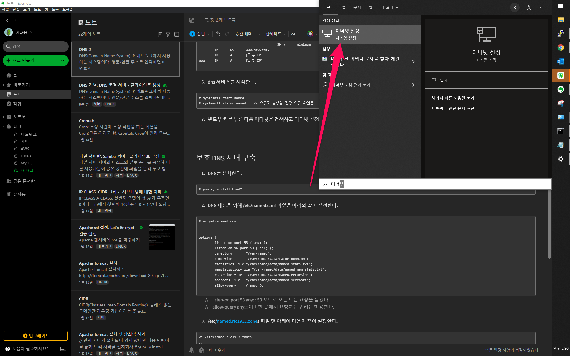 9. 윈도우 키를 누른 다음 이더넷을 검색 하고, 이더넷 설정을 누른다.